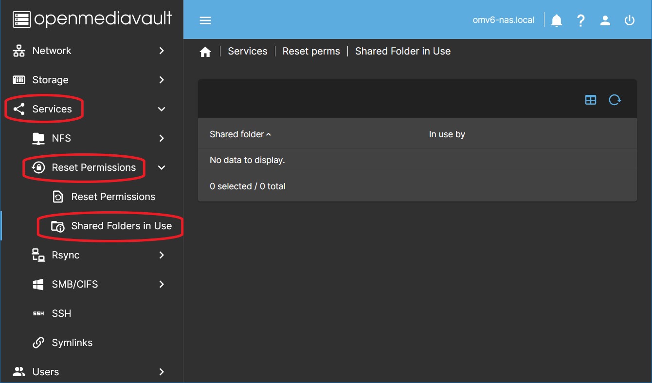 • Go to Services> Reset Permissions> Shared Folders in Use Here you can see a list of your OMV shared folders, next to each of them you can see the services that are currently associated with that shared folder. This is useful if at any time you want to delete a shared folder, since in order to do so, you must first remove the services that point to that shared folder. You just have to consult this list and delete them (or point to another folder) one by one.