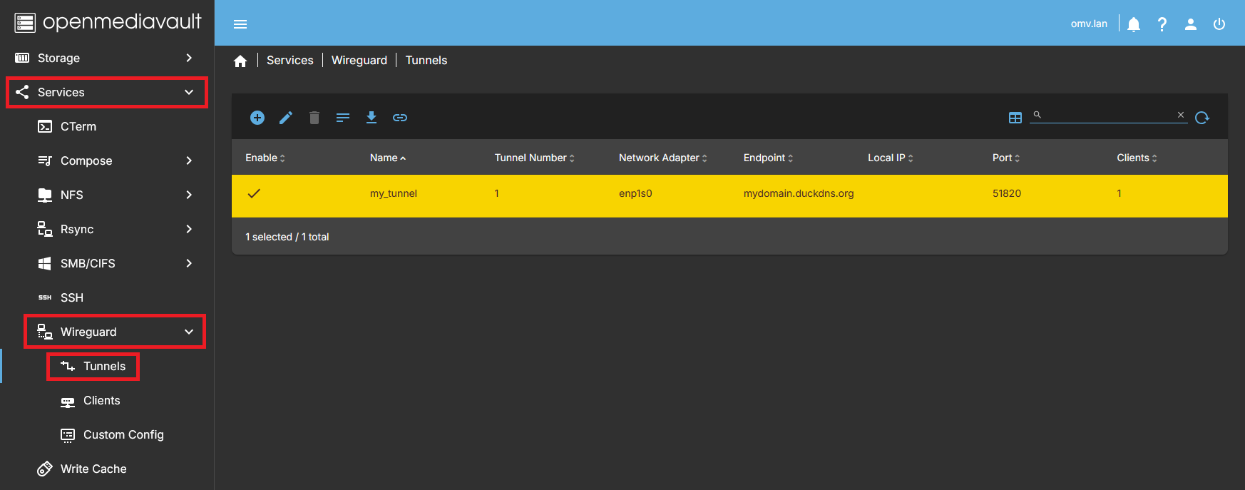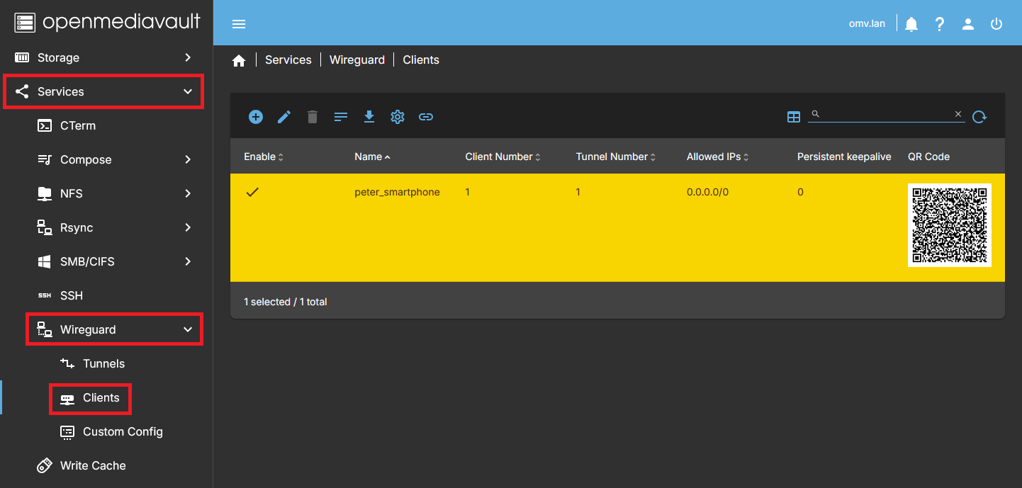 • The openmediavault-wireguard plugin integrates WireGuard into the OMV interface through the Tunnels and Clients tabs, allowing you to easily generate one or more encrypted point-to-site WireGuard VPN networks.