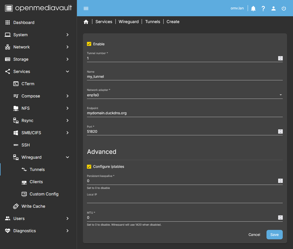 • In the OMV GUI go to Services > Wireguard > Tunnels and press the Create button.