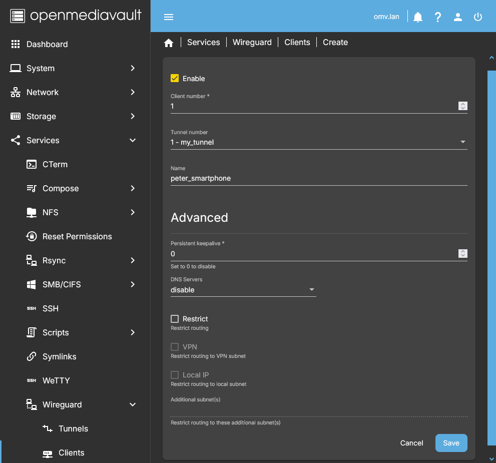 • In the OMV GUI go to Services > Wireguard > Clients and press the Create button.